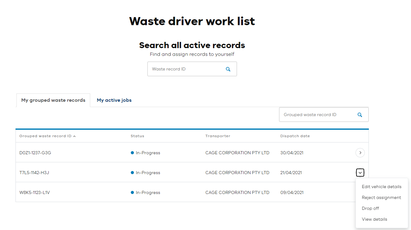 Find the grouped waste record you would like to pick up. Click the arrow next to the record and select 'edit vehicle details'.